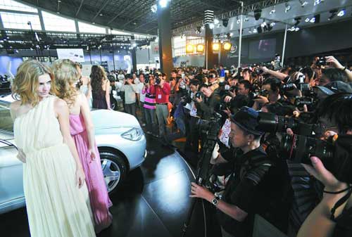網(wǎng)友“午夜鐘聲”正在奔馳展位上尋找著最合適的拍攝位置,“去年奔馳展位上的洋車模最為出彩,今天肯定要來看一看!彼9點(diǎn)就來到車展主會場,帶著全套攝影裝備,一個小時收獲了300多張照片,“回去整理好就貼我的博客上去。”他興沖沖地說。