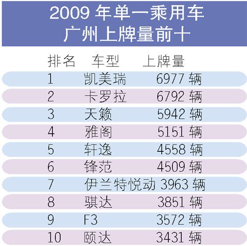 記者從車管所等權(quán)威部門獲得的最新數(shù)據(jù)顯示,2009年廣東省乘用車新車上牌量累計(jì)達(dá)683799輛,與2008年相比增幅達(dá)31.04%。其中,廣州乘用車新車上牌量總數(shù)為152235輛,與2008年同比增幅為33.88%,并以1300多輛的微弱優(yōu)勢超越深圳,坐上了全省冠軍寶座。凱美瑞成為 2009年廣州本地最熱銷的車型之一,上牌量達(dá)到6977輛,位居單一車型上牌量首位。