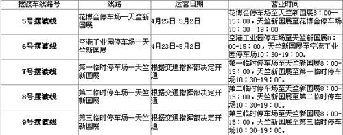 喜歡自駕車的朋友們,新國展在花博會設立了專門的停車場,大家可以把車停到這里然后乘坐車展的擺渡車直接前往展館。擺渡車的路線和運營時間如下表: