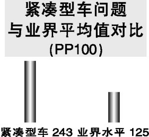 在細分市場方面,緊湊型車車主遇到的問題比行業(yè)平均水平高出80%以上,比高檔緊湊型車用戶的問題高出58%。幾乎20%的緊湊型車車主都投訴說他們遇到的問題比預期的要多,而整個業(yè)界有此抱怨的客戶也不過是10%。除此之外,緊湊型車細分市場中遇到的產品缺陷和功能障礙數(shù)量(243 PP100)幾乎是業(yè)界總體水平的兩倍(125 PP100)。