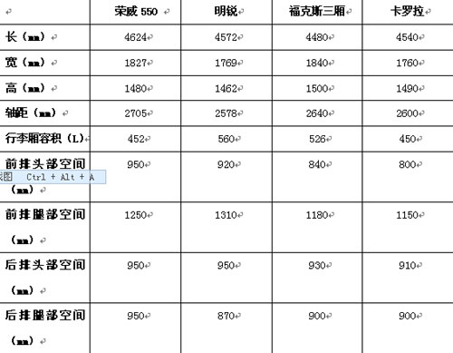 轎車(chē)的車(chē)身長(zhǎng)度和軸距的大小就決定了汽車(chē)內(nèi)部空間的大小。從車(chē)身長(zhǎng)度來(lái)看,榮威550最長(zhǎng),達(dá)到 4.624米,?怂谷龓疃蹋(chē)身僅長(zhǎng)為4.48米,而明銳和卡羅拉則都處于這個(gè)范圍之內(nèi)。