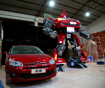 中新網(wǎng)4月15日電 2009上海國(guó)際車(chē)展即將開(kāi)幕,除了輪番轟炸的多款新車(chē)和概念車(chē)外,又有重磅消息傳來(lái)。據(jù)悉,此前曾攜東風(fēng)雪鐵龍C2機(jī)器人“大鬧”廣州車(chē)展的南京車(chē)迷,這次又有大動(dòng)作。一個(gè)高達(dá)4.5米、寬4米、厚3米、整體重量近2噸,帶聲、光、電系統(tǒng),以東風(fēng)雪鐵龍世嘉車(chē)為原形、結(jié)合中國(guó)傳統(tǒng)龍文化的巨型汽車(chē)人已經(jīng)在南京誕生,而且極有可能于上海車(chē)展現(xiàn)身。