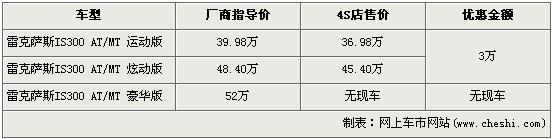 據(jù)4S店銷售人員介紹,因?yàn)閺S家對(duì)IS300系列減產(chǎn),所以目前的現(xiàn)車并不是很多。目前炫動(dòng)版和豪華版店內(nèi)都有現(xiàn)車,此兩款車在經(jīng)3萬元優(yōu)惠后,售價(jià)分別為36.98萬元和45.40萬元。而多了真皮座椅等配置的雷克薩斯IS300 豪華版店內(nèi)沒有現(xiàn)車銷售,所以不在此次優(yōu)惠列隊(duì)中。