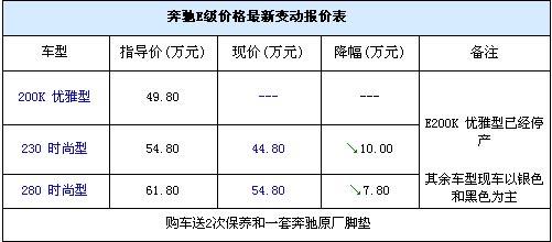 近日,編者從上海匯之星奔馳汽車服務(wù)有限公司獲悉。奔馳E級在滬最有優(yōu)惠達(dá)到了10萬元,目前E230 時(shí)尚型最低售價(jià)不到45萬元,E280 時(shí)尚型的售價(jià)也僅有54.8萬元,而E200K 優(yōu)雅型沒有現(xiàn)車,且確定已經(jīng)停產(chǎn)不再接受預(yù)定。具體詳情請見下表: