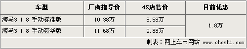 海馬系列車型一直有經(jīng)濟(jì)、省油等鮮明的特點。而在海馬3等一批車型上,則融合了更多時尚和運(yùn)動的元素,同時全車在設(shè)計、配置以及燃油性上均有提升。根據(jù)網(wǎng)上車市價格監(jiān)測系統(tǒng)顯示,目前海馬3在售的兩款車型最高優(yōu)惠達(dá)到了1.8萬元,具體車型以及價格如下: