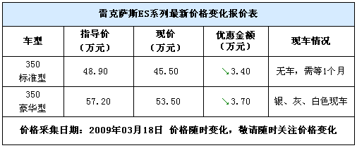 本周,編者聯(lián)系了上海和凌雷克薩斯4S店后了解到,現(xiàn)在該店雷克薩斯ES350有現(xiàn)車在售,可選車型僅為豪華型一款,現(xiàn)車有銀色,灰色和白色可選,標準款車型需提前1個月預(yù)定。價格方面,目前購買ES350最高可優(yōu)惠3.7萬元,店方還有部分禮品相贈,詳細價格信息請見下表: