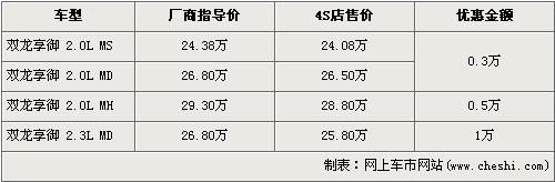 憑越野車起家的雙龍,向來是以生產(chǎn)SUV而著稱的,旗下的雙龍享御更是其的代表之作,其2.0L車型搭載的柴油發(fā)動(dòng)機(jī)更是源于奔馳的技術(shù)。雙龍享御共有四款車型,售價(jià)區(qū)間為24.38萬元-29.30萬元。近日根據(jù)網(wǎng)上車市價(jià)格監(jiān)測顯示,雙龍享御全系最高優(yōu)惠1萬元,詳情請(qǐng)看下表: