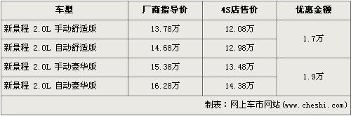 根據(jù)經(jīng)銷商處銷售人員介紹,“大嘴”新景程2.0L舒適版現(xiàn)金優(yōu)惠從1.9萬元下降到了1.7萬元,豪華版車型優(yōu)惠也從2萬元小幅下降到了1.9萬元。經(jīng)優(yōu)惠后,舒適版的手動與自動車型售價分別回升了12.08萬元及12.98萬元,豪華版車型的手動與自動車型售價也漲到了13.48萬元和14.38萬元。銷售人員還表示,目前店內(nèi)現(xiàn)車充足,顏色也全,消費者自由挑選的空間變得更加便利,更加自由。