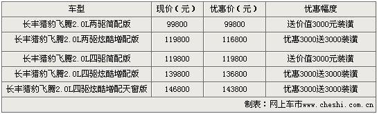 飛騰采用三菱最新研制的超級(jí)四輪驅(qū)動(dòng)系統(tǒng),使飛騰全身充滿活力。具有強(qiáng)勁的動(dòng)力性能和較好的平穩(wěn)性能。并且,具有低燃耗等優(yōu)點(diǎn)。近日根據(jù)網(wǎng)上車市價(jià)格監(jiān)測(cè)系統(tǒng)顯示,目前上海地區(qū)購(gòu)買長(zhǎng)豐獵豹累計(jì)最高優(yōu)惠6000元。具體車型售價(jià)見(jiàn)下表: