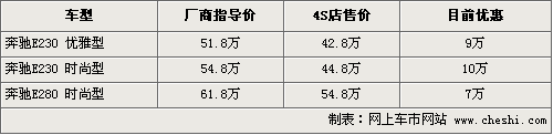 據(jù)4S店銷售人員介紹,目前奔馳E級現(xiàn)車都較為緊張,多數(shù)是訂單式的銷售方式。因為E級將推出改款車型,所以目前的優(yōu)惠幅度相對較大,其中E230時尚型最高優(yōu)惠達到了10萬元,E230降幅也在9萬元,E280時尚型優(yōu)惠7萬元后售價僅為54.8萬元。目前只有個別4S店內(nèi)有少量銀色和黑色現(xiàn)車供應,其他店均需要訂車。對想購買E級車的消費者而言,現(xiàn)在出手是最好的時機。