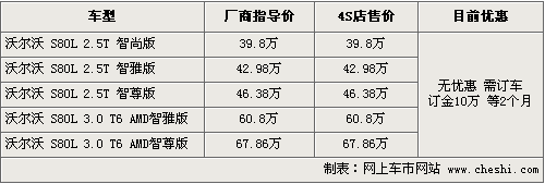 S80L加長(zhǎng)版是沃爾沃專門為中國(guó)市場(chǎng)量身打造的一款全新豪華車,軸距加長(zhǎng)140毫米,配置更加豪華,以滿足中國(guó)消費(fèi)者的需求。國(guó)產(chǎn)加長(zhǎng)版包括了2.5T和3.0兩個(gè)排量共5款車型。目前北京地區(qū)加長(zhǎng)版車型現(xiàn)車緊缺,均需要提前預(yù)訂,具體行情如下: