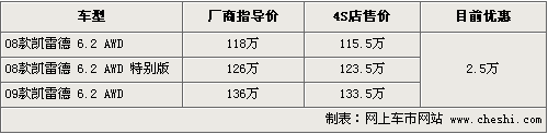 凱雷德是凱迪拉克家族一款大尺寸的SUV產(chǎn)品,結(jié)合6.2的大排量,從內(nèi)而外都給人粗曠和厚實(shí)的感覺。其搭載的全新的6前速手自一體自動(dòng)變速箱非常適用于低轉(zhuǎn)速高速巡航,也極大提高了瞬間的加速性能。根據(jù)網(wǎng)上車市價(jià)格監(jiān)測系統(tǒng)顯示,目前凱雷德優(yōu)惠2.5萬元,具體車型以及價(jià)格如下: