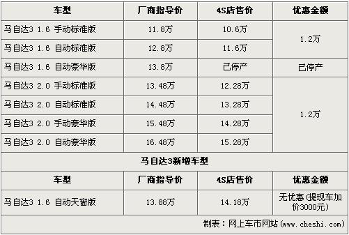 長安馬自達旗下主力車型-馬自達3以1.6L車型于06年開場,隨后又為車系注入了2.0L車型,2年時間馬3憑借動感的外觀以及優(yōu)越的性能博得了消費者的喜愛。在今年的4月2日,長安馬自達又為馬自達3注入了一款新車型-1.6L自動天窗版車型,新車型的加入為消費者們帶來了更大的選擇空間。近日據(jù)網(wǎng)上車市網(wǎng)站價格監(jiān)測系統(tǒng)顯示:除了新上市的1.6L自動天窗版車型外,馬3全系其他車型均有1.2萬元的現(xiàn)金優(yōu)惠,具體詳情請看下表: