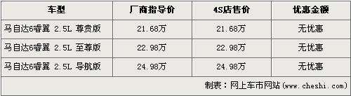 據(jù)北京一汽馬自達(dá)經(jīng)銷店銷售人員介紹,馬自達(dá)6睿翼此次上市的車型分為售價(jià)21.68萬元的2.5L尊貴版,售價(jià)為22.98萬元的2.5L至尊版和售價(jià)為24.98萬元的2.5L導(dǎo)航版三款車型。目前店內(nèi)可以接受馬自達(dá)6睿翼的購買訂單,訂金為2000元,并且可以無理由全額退還。消費(fèi)者還介紹,目前店內(nèi)已經(jīng)到有至尊版展車供消費(fèi)者品賞,第一批現(xiàn)車最早會(huì)在4月底到達(dá)經(jīng)銷店。