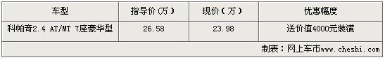 雪佛蘭Captiva科帕奇不僅豐富了雪佛蘭產(chǎn)品陣容,深化了雪佛蘭年輕活力、值得信賴的國際化品牌內(nèi)涵,更填補(bǔ)了上海通用汽車在中檔SUV細(xì)分市場上的空白。近日根據(jù)網(wǎng)上車市價格監(jiān)測系統(tǒng)顯示,上海地區(qū)購買雪佛蘭科帕奇2.4 AT/MT 7座豪華型 可以得到2.6萬元的價格優(yōu)惠。具體車型報價如下表: