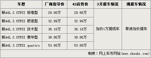 據(jù)北京地區(qū)奧迪經(jīng)銷(xiāo)店銷(xiāo)售人員介紹,近期購(gòu)買(mǎi)奧迪A4L的消費(fèi)者可以以原廠商指導(dǎo)價(jià)購(gòu)買(mǎi),提現(xiàn)車(chē)不再需要多交1萬(wàn)元現(xiàn)金。在售的新A4L分為5款車(chē)型,售價(jià)分別為:2.0T標(biāo)準(zhǔn)型為29.88萬(wàn)元、2.0T舒適性為32.99萬(wàn)元、2.0T技術(shù)型為36.18萬(wàn)元、2.0T為38.86萬(wàn)元、3.2Quattro為53.88萬(wàn)元。銷(xiāo)售人員還介紹,新A4L的內(nèi)飾分灰色、黑色和米色三種,一般車(chē)色均配以米色和灰色內(nèi)飾,只有紅色車(chē)身的新A4L配以黑色內(nèi)飾,店內(nèi)只有紅色車(chē)型數(shù)量不多,欲購(gòu)買(mǎi)其他顏色的消費(fèi)者需交定金1萬(wàn)元,約等1個(gè)月后提車(chē)。