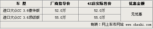 自去年廣州車(chē)展大眾CC亮相后,它的車(chē)型以及售價(jià)一直備受關(guān)注,同時(shí)這款車(chē)搭載的6速DSG雙離合變速箱以及四輪驅(qū)動(dòng)系統(tǒng)均成為其關(guān)注亮點(diǎn)。目前筆者從進(jìn)口大眾北京地區(qū)經(jīng)銷(xiāo)商處了解到,進(jìn)口大眾CC現(xiàn)車(chē)已經(jīng)到店,并有多種顏色可選,具體車(chē)型以及價(jià)格如下: