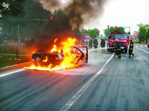 油箱存爆炸危險 消防隊員冒險撲救自燃尼桑轎車