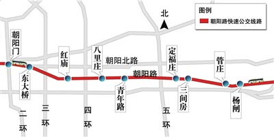 朝陽(yáng)路快速公交計(jì)劃于8月1日開通運(yùn)行,記者昨天從北京公交集團(tuán)獲悉,朝陽(yáng)路快速公交將從楊閘沿朝陽(yáng)路直到朝陽(yáng)門,全線共設(shè)21個(gè)車站。