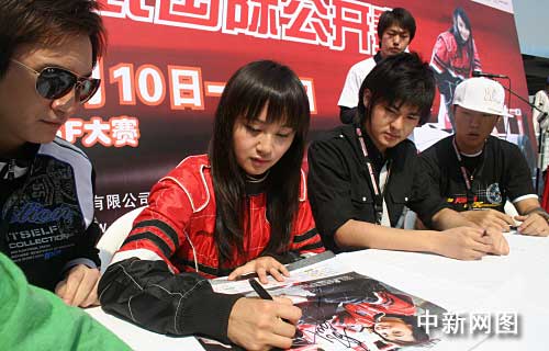 11月11日AGF亞洲方程式國(guó)際公開(kāi)賽珠海站決戰(zhàn)前,AGF第一巾幗車手曹穎與方程式車手在珠海國(guó)際賽車場(chǎng)簽贈(zèng)海報(bào)。數(shù)千名車迷、穎迷把現(xiàn)場(chǎng)圍得水泄不通,險(xiǎn)些擠垮舞臺(tái)。主辦方只好將原定40分鐘的簽名儀式縮短到半小時(shí)。