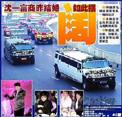 片斷回放:11月24日上午7時許,沈陽市鐵西區(qū)沈遼中路西部汽配城路段,一個自西向東行駛的車隊迎面駛來,一輛豐田霸道越野車(錄像車)行駛在車隊前面,隨后是一白一黑兩輛加長悍馬越野車,再往后就是并排行駛的悍馬越野車和豐田霸道。這些車的前后車牌都貼上了“百年好合”字樣,擋住了車牌號。悍馬打著雙閃一路向東,甚至連紅燈都毫不理會一闖而過。這場婚禮由中央電視臺主持人畢福劍主持,包括柯以敏、成奎安、湯鎮(zhèn)宗等在內(nèi)的明星紛紛登臺獻(xiàn)藝。