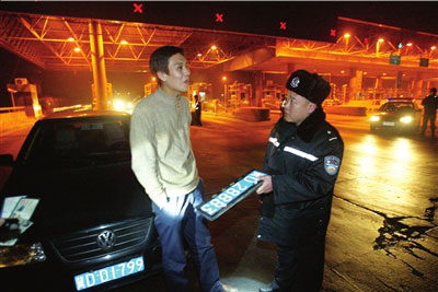 昨天凌晨,民警截獲了一輛套用外地號(hào)牌的機(jī)動(dòng)車。本報(bào)記者董世彪攝