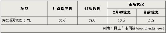 據(jù)謳歌經(jīng)銷商銷售人員介紹,謳歌08款MDX已經(jīng)停止進(jìn)口現(xiàn)車已賣完,以后也不會(huì)再引進(jìn)。目前在售的為謳歌09款MDX車型,09款謳歌-MDX的優(yōu)惠現(xiàn)已加大到11萬元,優(yōu)惠后售價(jià)也從原廠商售價(jià)80萬降到了69萬,跌破了70萬元。銷售人員還介紹,09款謳歌MDX增加的實(shí)用性的配件包括前下護(hù)板和后下護(hù)板,能避免惡劣路況對(duì)底盤帶來的損傷,并且09款謳歌MDX還新增了巴厘海藍(lán)和摩卡褐金兩種顏色,店內(nèi)現(xiàn)車非常充足,顏色也比較全,欲購買者挑選的空間非常大。