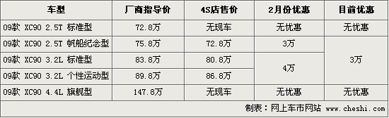 據(jù)沃爾沃4S店銷售人員介紹,目前銷售的沃爾沃XC90均是09款新車,其中2.5T帆船紀(jì)念版車型和3.2兩個(gè)排量車型可優(yōu)惠現(xiàn)金3萬元,其他2.5T標(biāo)準(zhǔn)版和4.4旗艦版沒有優(yōu)惠,F(xiàn)車方面,4S店有藍(lán)色款現(xiàn)車供應(yīng),個(gè)別款顏色需要消費(fèi)者先行預(yù)定。