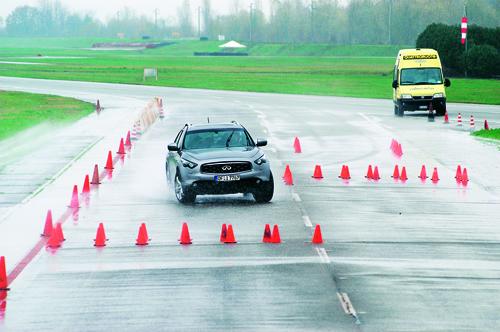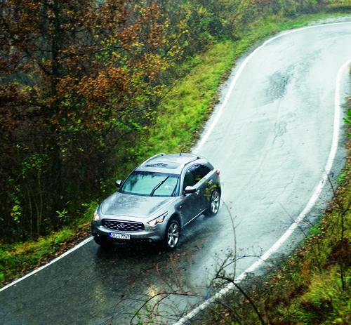 高速公路更適合FX37S的發(fā)揮,車子的隔音性很好,不過CDC主動式懸架似乎在模仿跑車效果。FX37S在瀝青路的抓地作用很強,給21英寸輪轂有力的支持,而且?guī)缀鯖]有車身晃動。另外,及時有力的轉(zhuǎn)向可與轎跑車媲美,為車子的操控性作出了很多貢獻?傊诠飞,英菲尼迪FX37S快速、安全、有樂趣,但如果要在雪地駕駛,我們建議小號輪轂和冬季輪胎。通常情況下,F(xiàn)X37S采用后輪驅(qū)動,一旦輪胎打滑,扭矩將通過中央離合器給前輪分配扭矩,前輪最大比例可獲得50%的輸出扭矩。