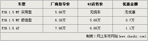 據(jù)比亞迪汽車北京地區(qū)4S店銷售人員介紹,比亞迪F3R全系均有優(yōu)惠,最高配的1.6L自動檔車型的優(yōu)惠金額為1.1萬元,達到了全系最高,1.5手動舒適版優(yōu)惠金額為7000元。經(jīng)過優(yōu)惠后,1.5L手動舒適型的售價降為5.68萬元,頂配的1.6L自動檔售價降為了6.88萬元。銷售人員還介紹,1.5L手動實用版已無現(xiàn)車,所以不在此次優(yōu)惠范圍內(nèi)。