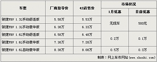 據(jù)經(jīng)銷商處銷售人員介紹,目前駿捷FRV在售的有五款車型,優(yōu)惠金額都分別有所下降。1.3L車型優(yōu)惠500元,1.6L手動檔車型優(yōu)惠從2000元降到了1000元,1.6L自動檔車型優(yōu)惠也從5000元降到了3000元。經(jīng)過優(yōu)惠調(diào)整后,1.6L手動舒適型售價變?yōu)?.48萬元,1.6L手動豪華版售價變?yōu)?.28萬元。全系最高配的1.6L自動豪華型售價回升到了8萬元區(qū)間。
