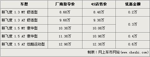 據(jù)廣州本田北京地區(qū)4S店銷售人員介紹,新飛度 1.5L炫酷運動版的優(yōu)惠金額為6000元。新飛度在售車型分為1.3L及1.5L共5個車型在售,1.3L手動舒適版的優(yōu)惠金額為2000元,現(xiàn)售價為8.48萬元。1.3L自動舒適版的優(yōu)惠金額為3000元,現(xiàn)售價為9.38萬元。1.5L豪華版的手動和自動車型經(jīng)4000元優(yōu)惠后,現(xiàn)售價分別為10.08萬元和10.98萬元,1.5L炫酷運動版的優(yōu)惠6000元,現(xiàn)售價為12.38萬元。銷售人員還介紹,目前1.3L的車型店內(nèi)無現(xiàn)車,欲購買車需交1000元訂金,約等半個月才可提車。