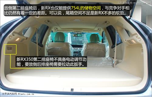 即使放倒了第二排座椅,新RX也只能提供754L的儲(chǔ)物空間,與一種德、美系車(chē)型動(dòng)輒超過(guò)1500L的后排儲(chǔ)物空間相比,仍然有著一定的差距?梢哉f(shuō),偏小的儲(chǔ)物空間是新RX350上不多的軟肋。