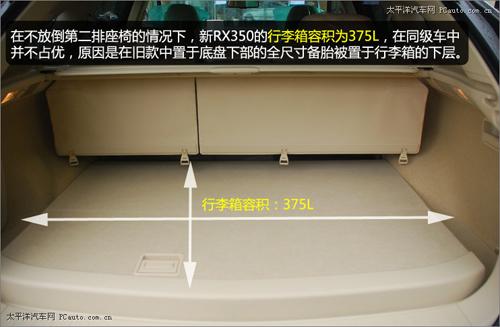在不放倒第二排座椅的情況下,新RX350的行李箱容積為375L,在同級(jí)車(chē)中并不占優(yōu),原因是在舊款中置于地盤(pán)下部的全尺寸備胎被置于行李箱的下層。這樣設(shè)計(jì)的優(yōu)點(diǎn)就是讓司乘人員可以在車(chē)輛需要更換輪胎的時(shí)候,不至于要趴在徹底拆卸備胎。目前,越來(lái)越多的城市SUV采用這樣的設(shè)計(jì)。