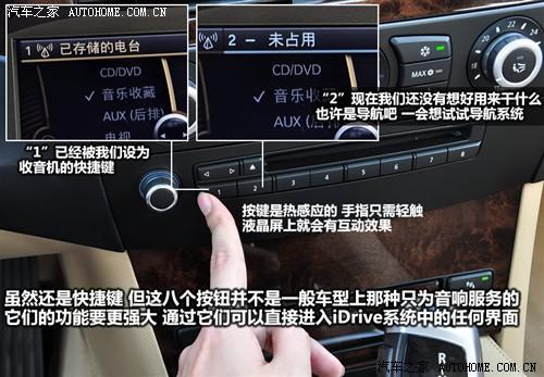 還有一點(diǎn)比較有意思的是,寶馬5系的中控臺(tái)面板上DVD槽下方帶有8個(gè)快捷鍵,一般來(lái)說(shuō)這些快捷鍵是服務(wù)于音響系統(tǒng),用來(lái)存儲(chǔ)電臺(tái)或選擇CD的,但在這里它們的功能要比我們想象中的更強(qiáng)大。當(dāng)我們停留在任何iDrive系統(tǒng)界面時(shí),都可以通過(guò)長(zhǎng)按一個(gè)快捷鍵來(lái)將該界面存儲(chǔ)下來(lái),舉個(gè)例子,當(dāng)我在iDrive系統(tǒng)中調(diào)節(jié)到“已存儲(chǔ)電臺(tái)”這個(gè)界面時(shí),我長(zhǎng)按快捷鍵1就可以將“已存儲(chǔ)電臺(tái)”界面存儲(chǔ)下來(lái),以后如果我想調(diào)出“已存儲(chǔ)電臺(tái)”界面時(shí)只要按下快捷鍵1就行了,非常方便。