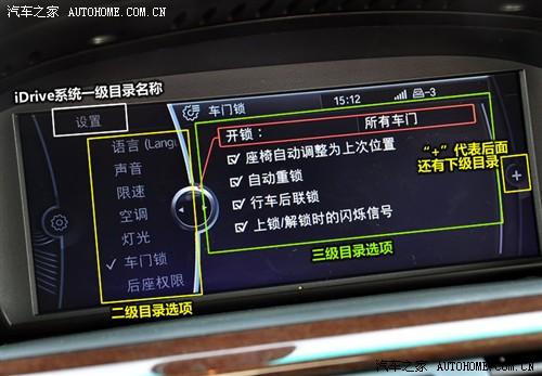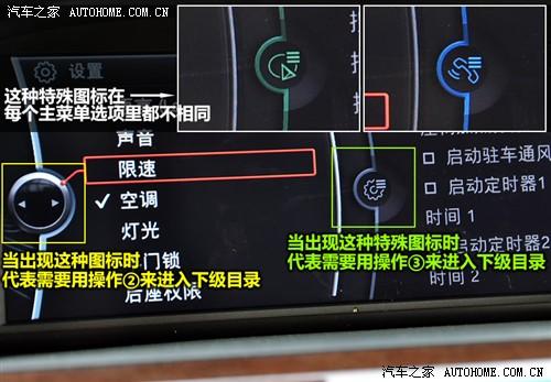 當(dāng)我們進(jìn)入“設(shè)置”選項(xiàng)的二級(jí)目錄時(shí),在二級(jí)目錄的左右兩邊我們可以看到兩種不同的圖標(biāo)。左邊的圓形帶有兩個(gè)小箭頭的圖標(biāo)表示如果想進(jìn)入左側(cè)的上級(jí)目錄需要使用②撥動(dòng)方式向左撥動(dòng)旋鈕進(jìn)入,而右邊的特殊圖標(biāo)表示如果想進(jìn)入右側(cè)的下級(jí)目錄需要使用③向下按的方式進(jìn)入?偟膩(lái)說(shuō),這種左右分列的目錄形式比老款要更符合人們的日常習(xí)慣,因此比老款iDrive系統(tǒng)更容易得到用戶的認(rèn)可。