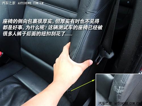 前排座椅的包裹性非常出色,特別是靠背兩側(cè)的包裹隆起很高,但我們也發(fā)現(xiàn)這種座椅的一點(diǎn)不足之處:側(cè)面很容易被褲子后兜的紐扣刮到,時(shí)間稍長(zhǎng)就成了試駕車(chē)現(xiàn)在的樣子:真皮已經(jīng)被刮花了。