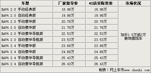 2009年4月10日,一汽豐田正式推出了首款SUV車型RAV4,售價18.98-26.43萬元。作為一款日系經(jīng)典城市SUV車型,起初以進(jìn)口方式銷售時就得到了廣大消費者的喜愛,此次國產(chǎn)后由于價格較進(jìn)口車型有所降低,進(jìn)一步提升了RAV4的性價比。那么剛剛上市RAV4的市場狀況究竟如何呢?記者在走訪北京地區(qū)一汽豐田4S店時了解到:目前國產(chǎn)RAV4現(xiàn)車現(xiàn)已到店,但是由于貨源比較緊張,消費者需要加價1.5萬元或2萬元裝飾才可以提到現(xiàn)車。具體車型售價見下表: