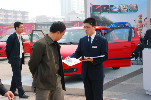 中新網(wǎng)4月19日電在2009(第六屆)全國(guó)百?gòu)?qiáng)縣市汽車(chē)巡展壽光站的現(xiàn)場(chǎng)筆者發(fā)現(xiàn)了這樣的一幕,與其他廠商不同,上海大眾斯柯達(dá)的經(jīng)銷(xiāo)商濰坊天和汽車(chē)銷(xiāo)售服務(wù)有限公司的銷(xiāo)售人員,不但在展位為前來(lái)咨詢(xún)的消費(fèi)者進(jìn)行講解,而且還走出展位,走到展位外面為消費(fèi)者講解,吸引消費(fèi)者來(lái)了解更多車(chē)輛信息。