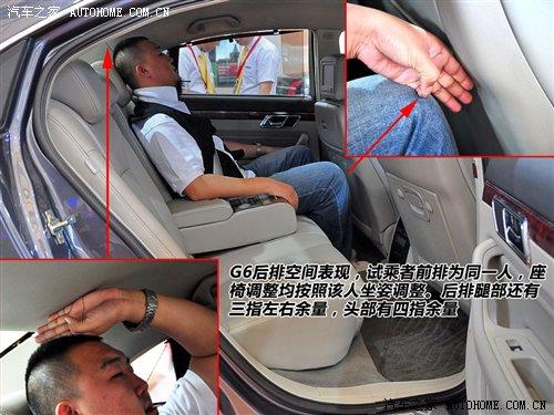 對(duì)于這種大尺寸車型最慣性的思路是感受它的空間。G6前排坐進(jìn)180cm以上乘客時(shí),頭部還有一拳以上余量。同一個(gè)人體驗(yàn)后排,腿部三指、頭部四指的空間余量只能說比較一般。