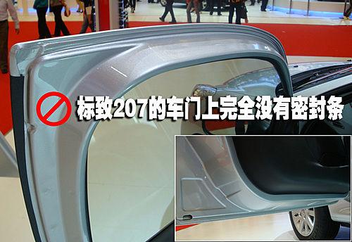 標(biāo)致207在車門一側(cè)完全沒有設(shè)計(jì)密封條,在其車門上也沒有任何可以固定密封條的固定點(diǎn)。不過在車身一側(cè)門框的位置設(shè)計(jì)了兩道密封,不過盡管是這樣標(biāo)致207依然是這項(xiàng)對(duì)比中最差的一個(gè)。