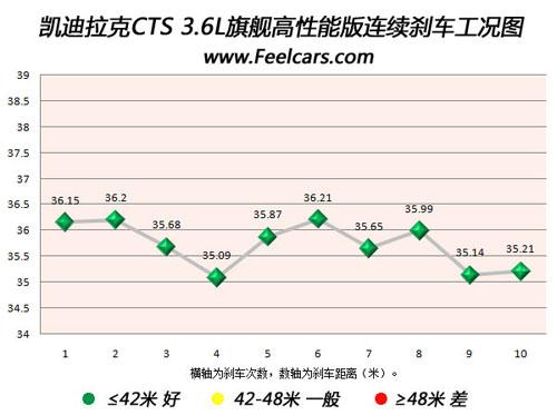 再來看看新CTS的連續(xù)10次剎車成績(jī),最差成績(jī)?yōu)?6.21米,與最好成績(jī)差距僅為1.1米,且大部分成績(jī)均在36米以內(nèi),說明新CTS的剎車系統(tǒng)散熱效果非常好,始終保持在最佳的工作狀態(tài),沒有出現(xiàn)熱衰減現(xiàn)象。