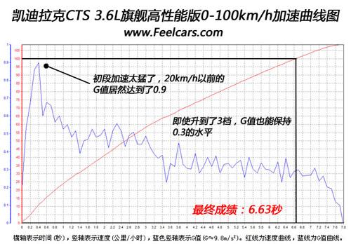 通過下面的曲線圖可以看出,新CTS的初段加速非常猛,20km/h以前的G值達(dá)到了0.9G,而即使變速器升到了3檔,G值也能保持0.3G的水平。