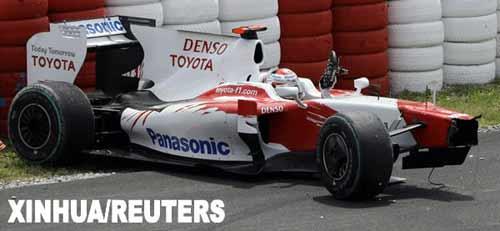 5月10日,豐田車隊車手特魯利駕駛的賽車發(fā)生碰撞后停下。當日,F(xiàn)1西班牙大獎賽落幕,布朗GP車隊的英國車手巴頓奪得冠軍。新華社/路透