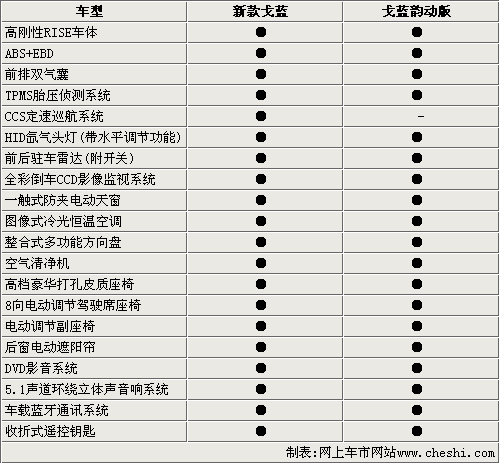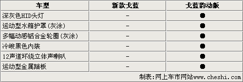 新款戈藍還增加了戈藍韻動版車型,這款新車在整車的設計方面都有新的變化。在外觀方面,戈藍韻動版采用深灰色HID大燈、運動型灰色涂裝水箱護罩以及多幅動感鋁合金輪轂。內飾方面采用了黑色內飾風格,配備了12聲道環(huán)繞立體聲喇叭和運動型金屬踏板,使整車看上去更具運動氣質。