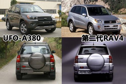 同樣這么做的還有永源UFO-A380,光聽著UFO和A380的威名就已經(jīng)讓人印象深刻了,一看外觀,號稱“用飛機的技術(shù)”研制出來的UFO-A380赤裸裸地照搬了第二代豐田RAV4,逼得豐田只好在國內(nèi)直接投產(chǎn)第三代RAV4。