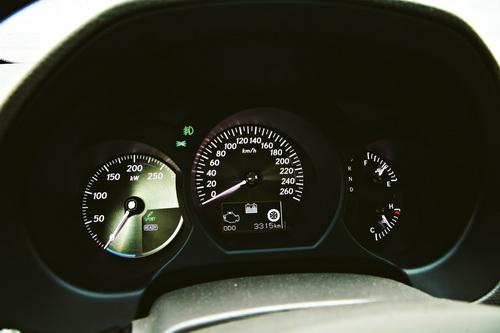 由于使用了電動機系統(tǒng),GS450h的儀表盤并沒有設置發(fā)動機轉(zhuǎn)速表,取而代之的一個功率表,隨時顯示電動機的瞬時輸出功率;至于中間的車速表和右邊的綜合信息表在所有車型上則都是一樣的。GS系列車型儀表盤另一個特點就是具有ECD電子色控裝置,能夠根據(jù)照射在儀表盤上的光線強度自動調(diào)節(jié)自身亮度,保證駕駛員能夠清晰地讀取數(shù)據(jù)——安全實用的配置。