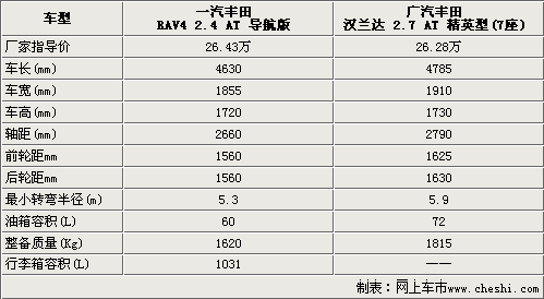 SUV市場一直是車市中增長比較強勁的一股力量,尤其是受到都市人喜愛的城市SUV車型。在新車層出不群的同時,競爭也在逐漸加大。豐田汽車就看準了這一市場,在今年上半年分別于一汽豐田和廣汽豐田,投產(chǎn)了兩款城市SUV車型:RAV4和豪華城市SUV漢蘭達,售價分別為18.98萬—26.43萬和24.88-42.98萬元。從兩款車型的售價上看,在25萬這個價格區(qū)間都有車型銷售。那么這兩款同品牌、同價位不同級別的城市SUV,它們都各自有什么特點和優(yōu)勢呢?為了能讓您可以更加清楚地了解它們,我們選取了一汽豐田RAV4 2.4自動導航版和廣汽豐田漢蘭達2.7精英型7座這兩款車型,來做一個全方位的對比。一汽豐田RAV4 2.4自動導航版售價為26.43萬元,廣汽豐田漢蘭達2.7精英型7座的售價為26.28萬元,兩款車型的售價僅相差了1500元。