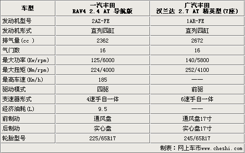 一汽豐田RAV4 2.4自動導航版和廣汽豐田漢蘭達2.7精英型7座這兩款車型都采用的是直列四缸的引擎,只是在發(fā)動機排量上不同。漢蘭達和RAV4的發(fā)動機都具有豐田獨步天下的VVT-i技術,實現(xiàn)了卓越的動力輸出,同時進一步提高了燃油經(jīng)濟性。在變速器方面,RAV4就相對比較落后了,只采用了4檔自動變速器。而漢蘭達的6速手自一體變速箱則可以讓駕駛者充分的享受到駕駛的樂趣。一汽豐田RAV4和廣汽豐田漢蘭達都采用的是前通風盤式后實心盤式的剎車,但漢蘭達的剎車盤達到了17寸,可以更有效的降低剎車距離。