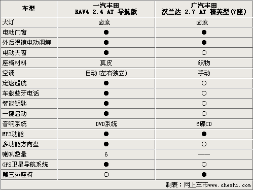 一汽豐田RAV4 2.4自動(dòng)導(dǎo)航版和廣汽豐田漢蘭達(dá)2.7精英型7座的舒適配置相差比較懸殊。RAV4 2.4自動(dòng)導(dǎo)航版屬于RAV4車系中的頂配車型,舒適配置可謂是應(yīng)有盡有,電動(dòng)天窗、真皮座椅、自動(dòng)空調(diào)、定速巡航、多功能方向盤、DVD影音系統(tǒng)等設(shè)備都成為了標(biāo)準(zhǔn)配置。而漢蘭達(dá)2.7精英型7座屬于該車系中的低配車型,在舒適配置方面盡顯于基本使用。但在空間利用上漢蘭達(dá)還是比較具有優(yōu)勢的,首先漢蘭達(dá)最多可以承載7名乘客,而且室內(nèi)空間可以靈活多變,放倒比例達(dá)到了4:2:4,可以更加有效的方便乘客置放大件物品。